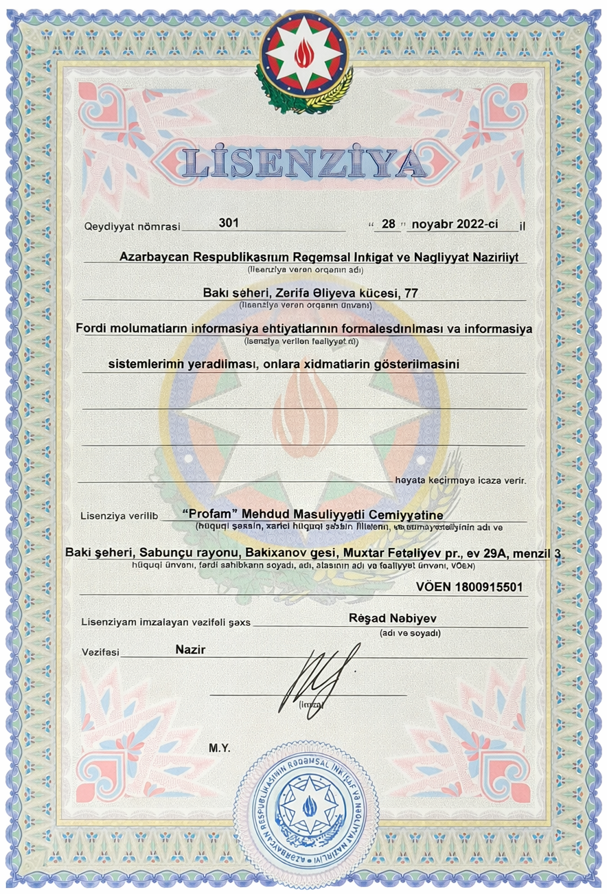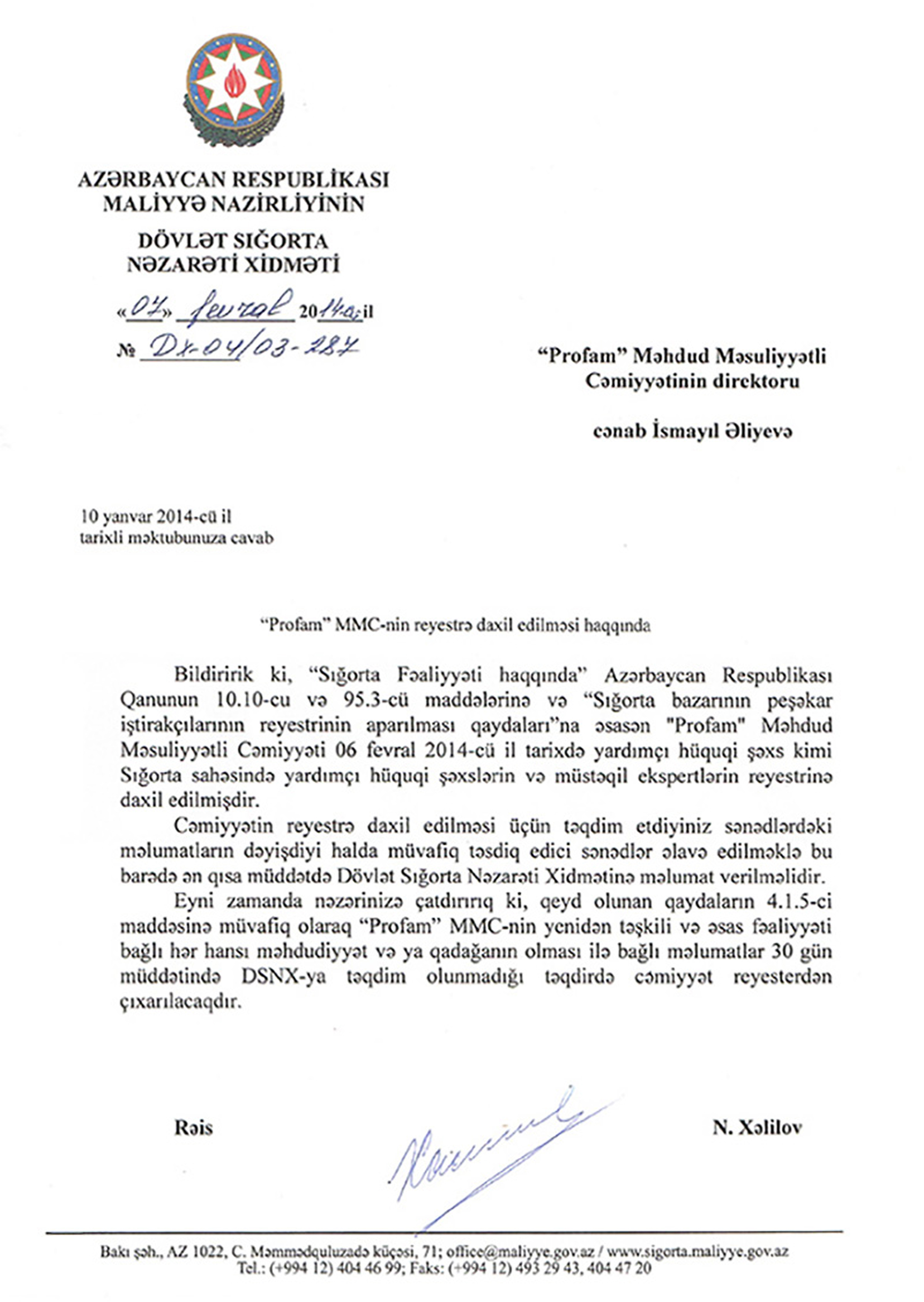 07.02.2014 tarixində şirkət sığorta sahəsində vasitəçilik və müstəqil ekspert lisenziyası aldı!