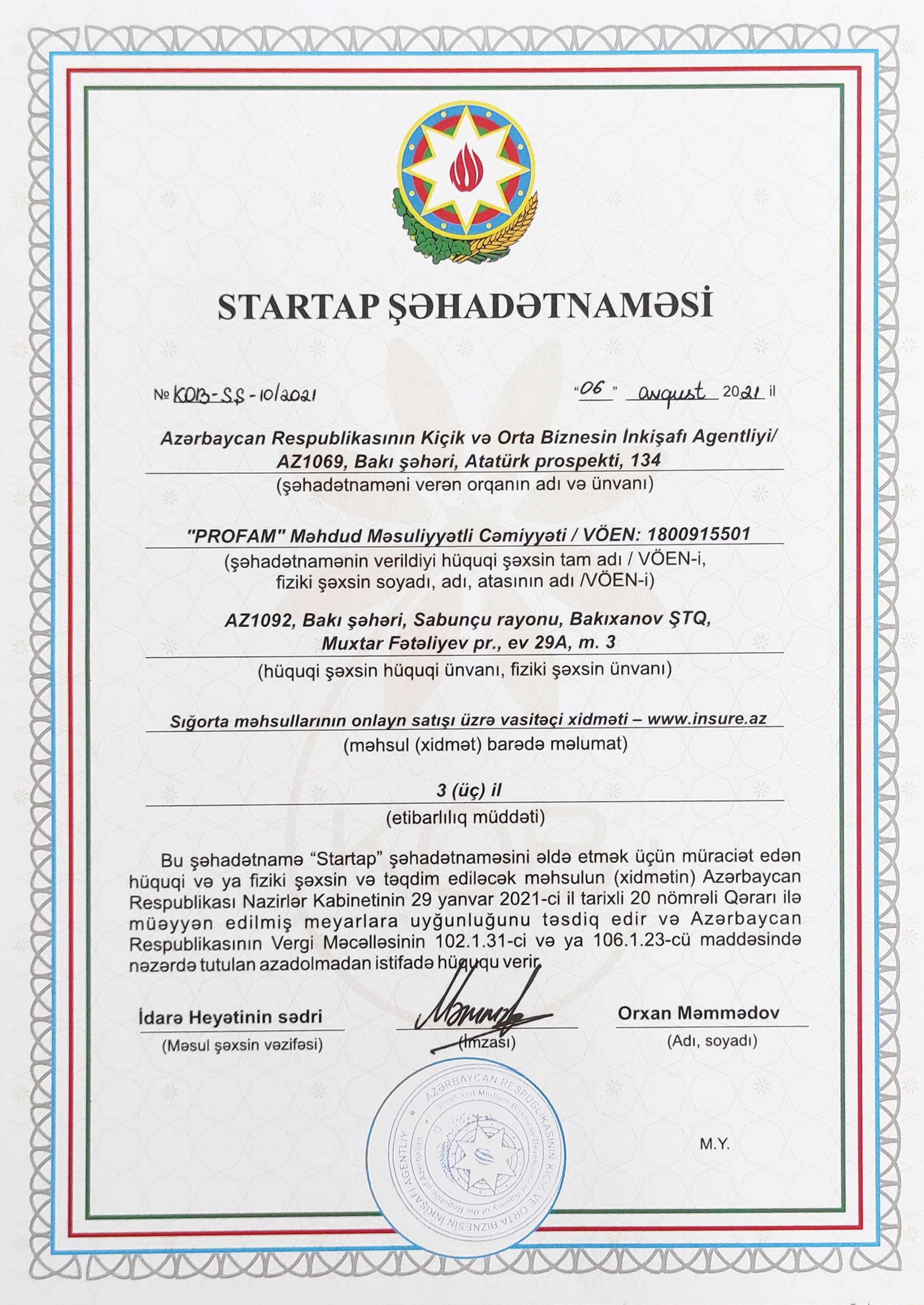 06.08.2021 tarixində şirkət startup şəhadətnaməsi aldı. Portaldan 58 mindən artıq sığorta müqaviləsi satıldı və 3,2 mln-dan artıq sığorta haqqı toplandı!